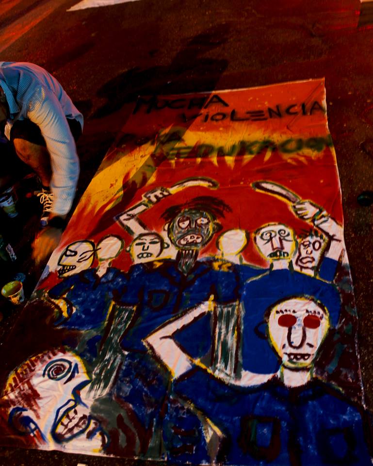 El reclamo antiminero desencadenado en Famatina, primero ante la Barrick Gold y luego ante Osisko, despertó un gigante social que se materializó en marchas históricas y multitudinarias en las principales ciudades de la provincia. “El Famatina No Se Toca” actuó como bandera frente a una ciudadanía que comenzaba a repudiar la violencia institucional. “La problemática represiva se venía cuestionando ya con La Brigada muralista Victoria Romero en el primeros años en el corte de Famatina”, explica Ayelén Argañaraz, muralista y compañera de Grimaux en La Casa, un espacio cultural, “Las estrategias del gobierno fueron mediatizar la ley antiterrorista, militarizar el territorio y tapar todas las pintadas en contra de la megaminería contaminante; ante esta problemática, un grupo de 4 personas decidimos pedir autorización escrita con firma del dueño de cada pared y pintarla con consignas a favor de la vida y en contra de la mina, pretendíamos dejar en evidencia el accionar municipal y policial que iba en contra de los intereses del pueblo”.